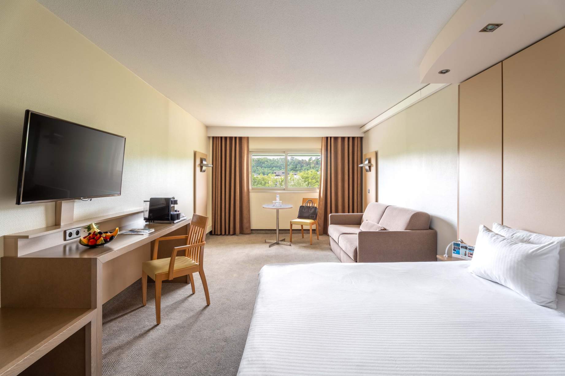 Die Zimmer sind schön ausgestattet in beruhigenden Beigetönen, geräumig, lichtdurchflutet und einige bieten einen Blick auf die Saône oder das Olympiaschwimmbecken in entspannender Atmosphäre.